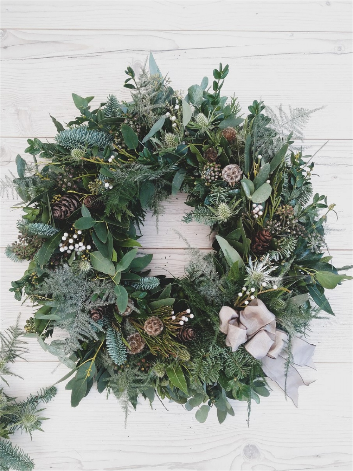 Misty Mornings is filled with luscious greenery along with natural decorations of thistle flowers, cones and shimmery sprays of Asparagus. A truly aromatic wreath with gentle scent of the Bay and Eucalyptus providing a gorgeous welcome through your door. Garlands and table centres are also available as part of this range.