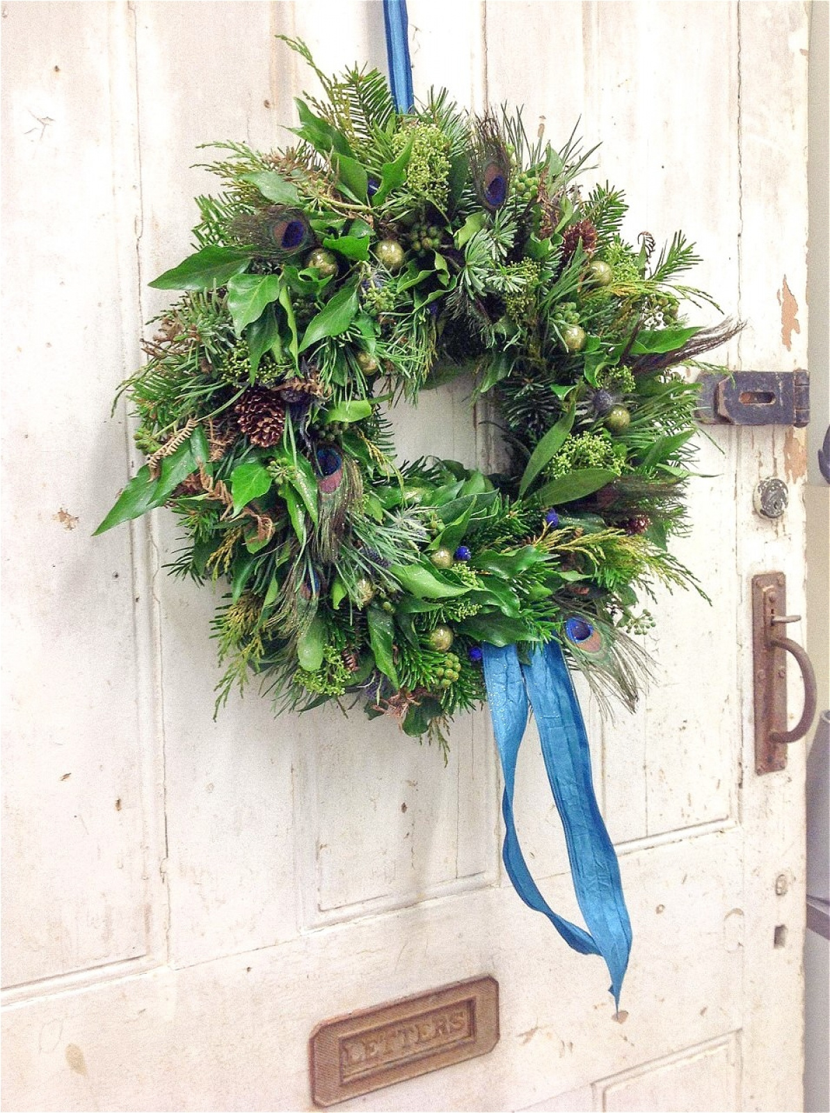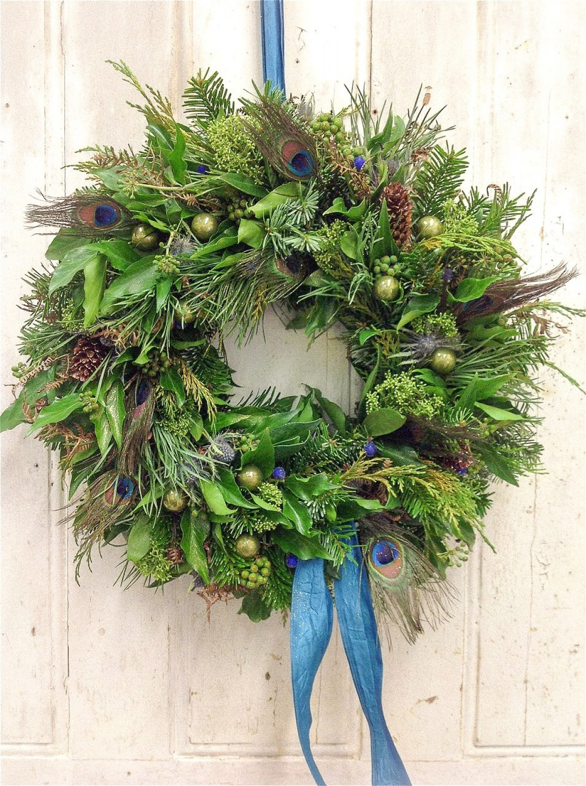 Peacock Garden luxury wreath is filled with luscious woodland greenery decorated with cones, green glass baubles, blue berries and gorgeous Peacock feathers. This wreath comes with a teal ribbon.